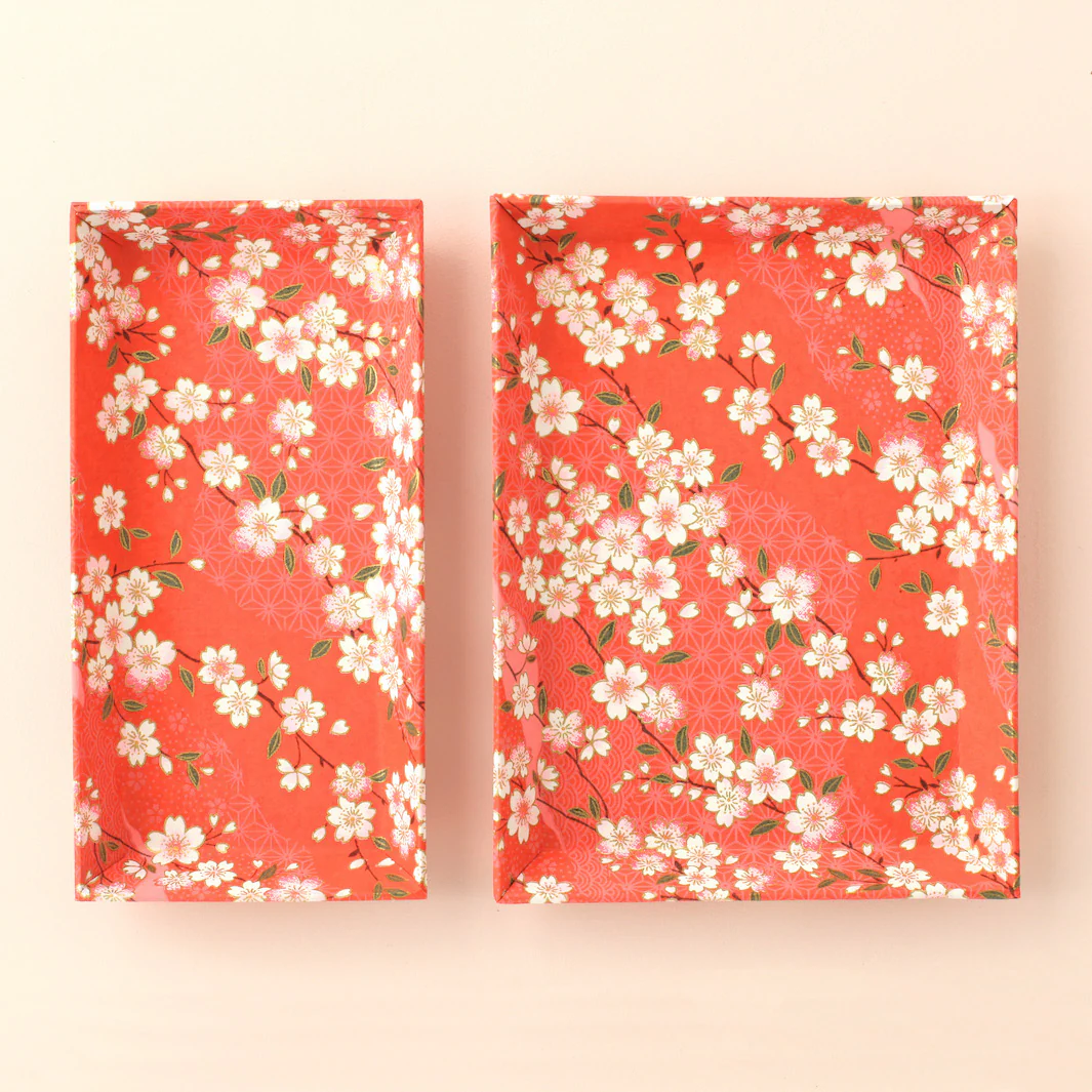 Jolis vide-poches recouverts de papier japonais aux motifs de fleurs de cerisier (sakura) et motifs variés dans les tons rouge orangé.