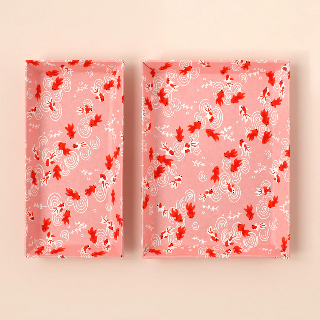 Jolis vide-poches recouverts de papier japonais aux motifs de poissons rouges (carpes koï) sur fond rose.
