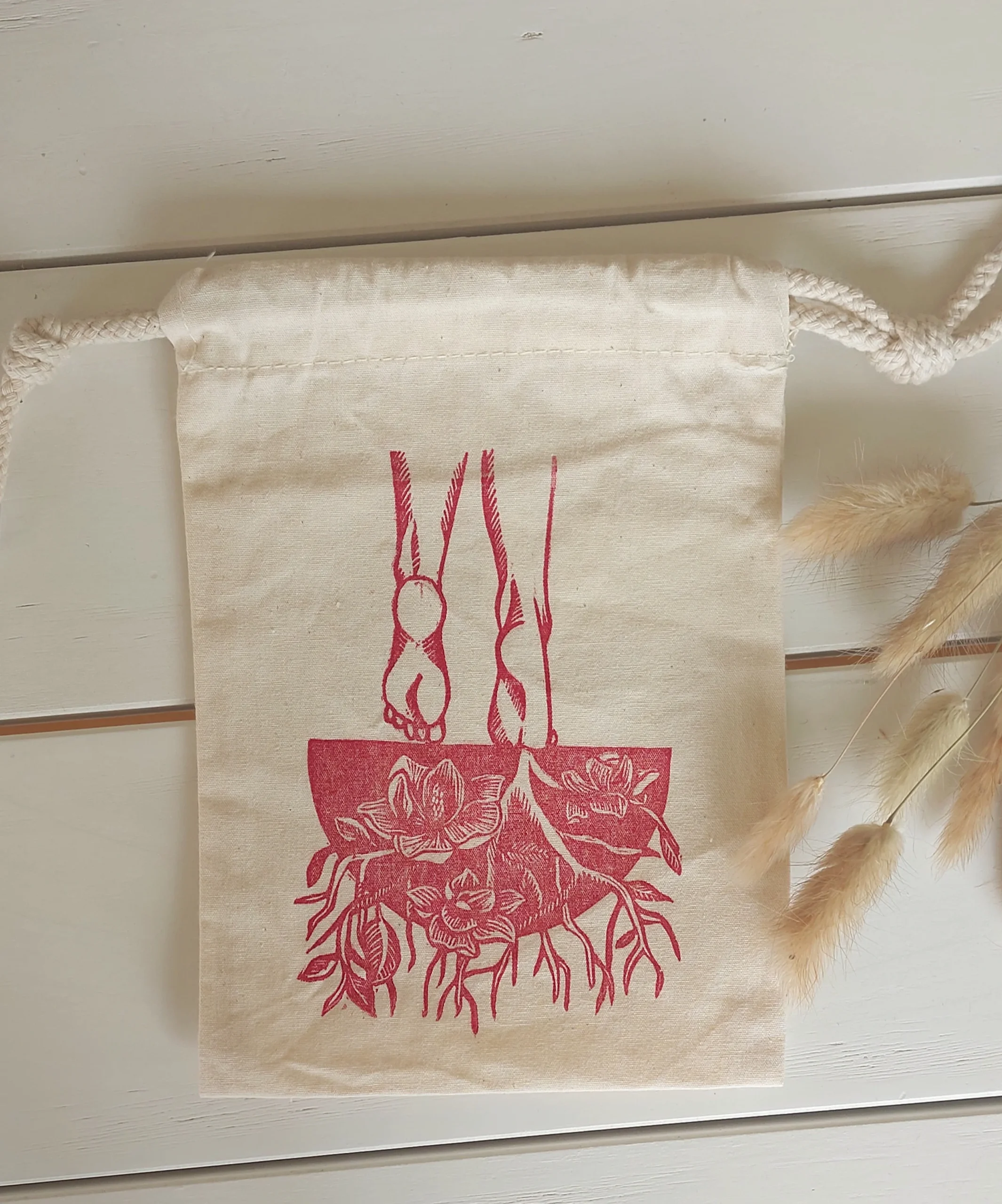 Chaque motif est linogravé puis pressé à la main ce qui confère l’unicité de chaque pochon.