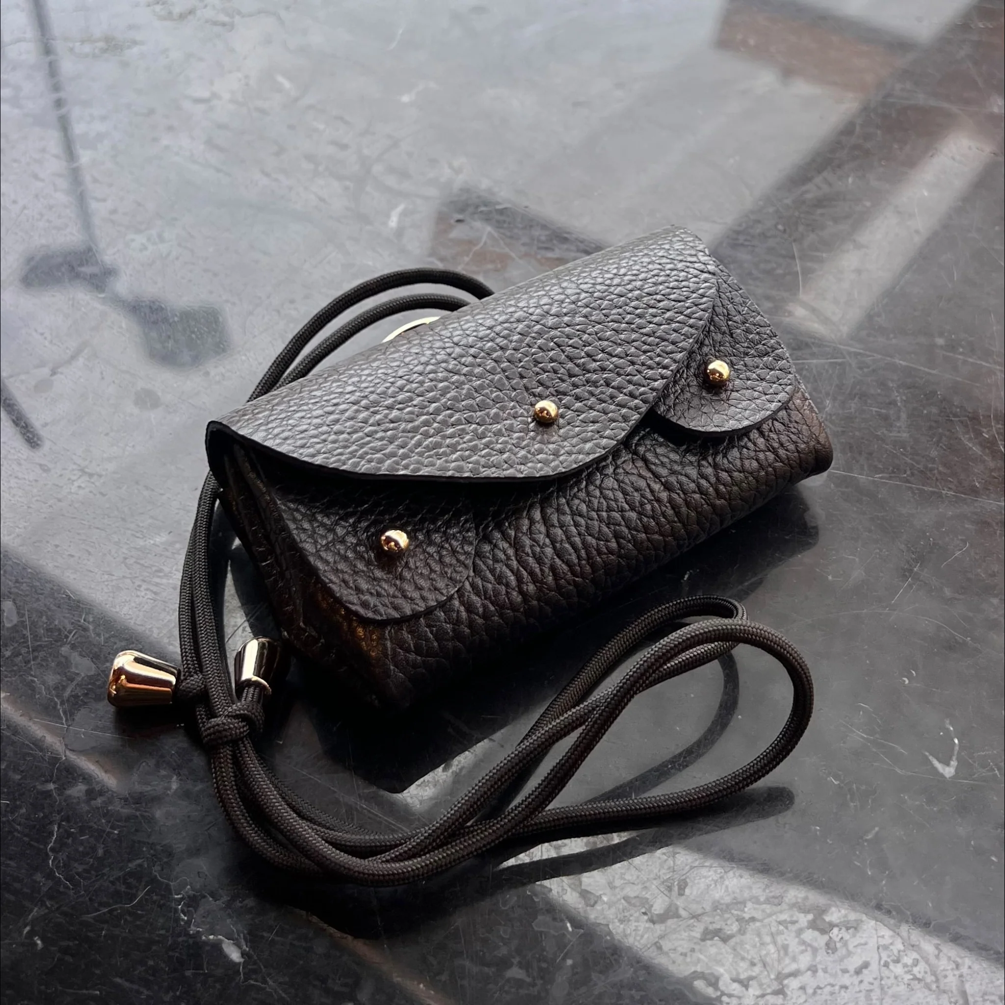 Ou bien portez-le comme un mini-sac en cuir avec un cordon coulissant.