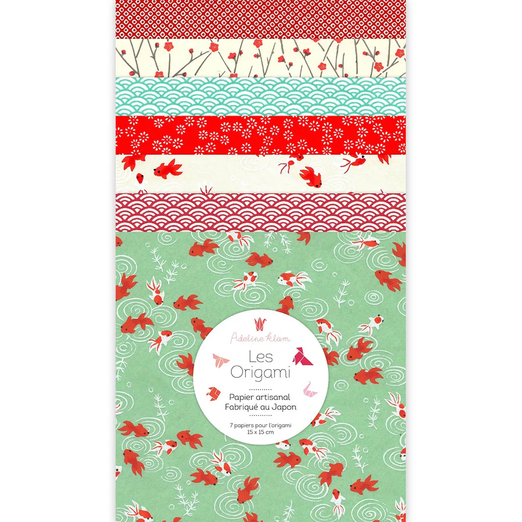 Cet adorable set de 7 carrés de papiers japonais (washi, yuzen, chiyogami) pour l’origami de 15cm de côté, dans des tons bleu nuit, bleu canard, bleu marine, bleu turquoise, vert amande et vert d’eau de la gamme « Orage » (Z11) a été imaginé par Adeline.