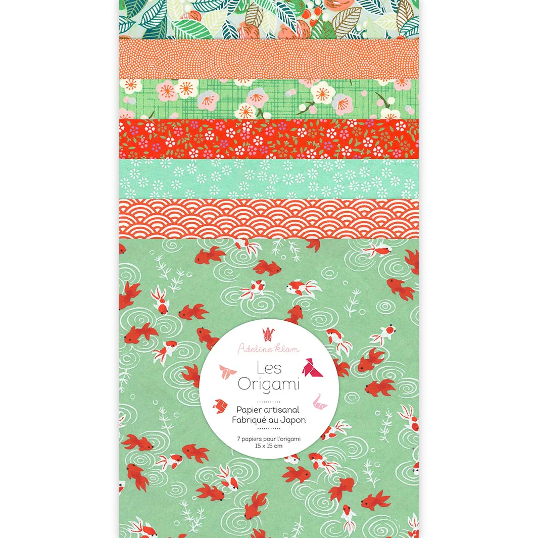 Ce joli set de 7 carrés de papiers japonais (washi, yuzen, chiyogami) pour l’origami de 15cm de côté, dans des tons bleu foncé, bleu turquoise, vert menthe et rose de la gamme « Valencia » (Z9) a été imaginé par Adeline.