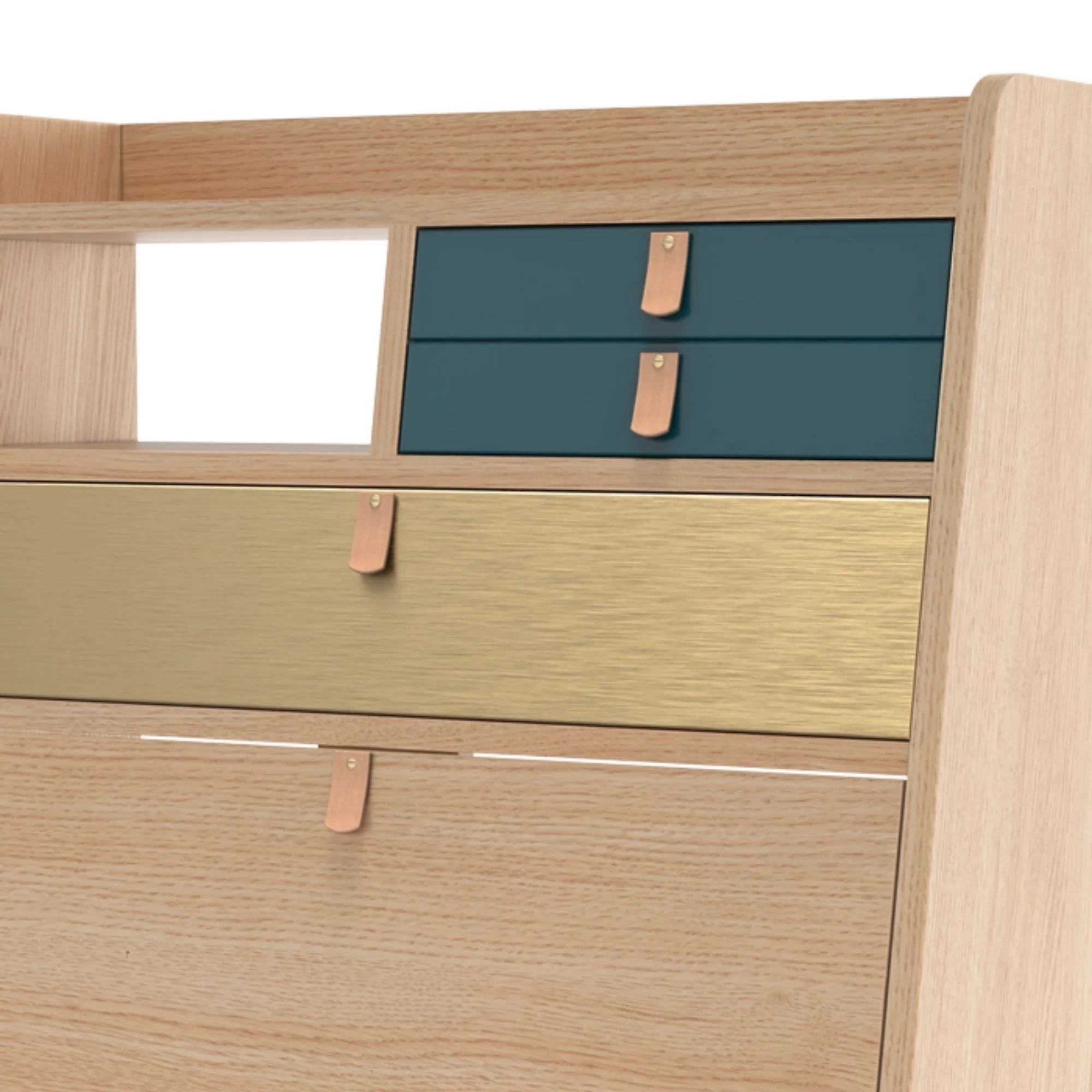 Gaston est conçu au Portugal : fabrication artisanale, poignées en cuir, placage chêne ou noyer, peinture laquée : il ne se refuse aucun plaisir. Il s’installe facilement au mur avec un tasseau de bois fourni par nos soins.