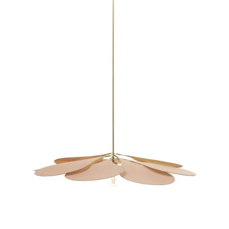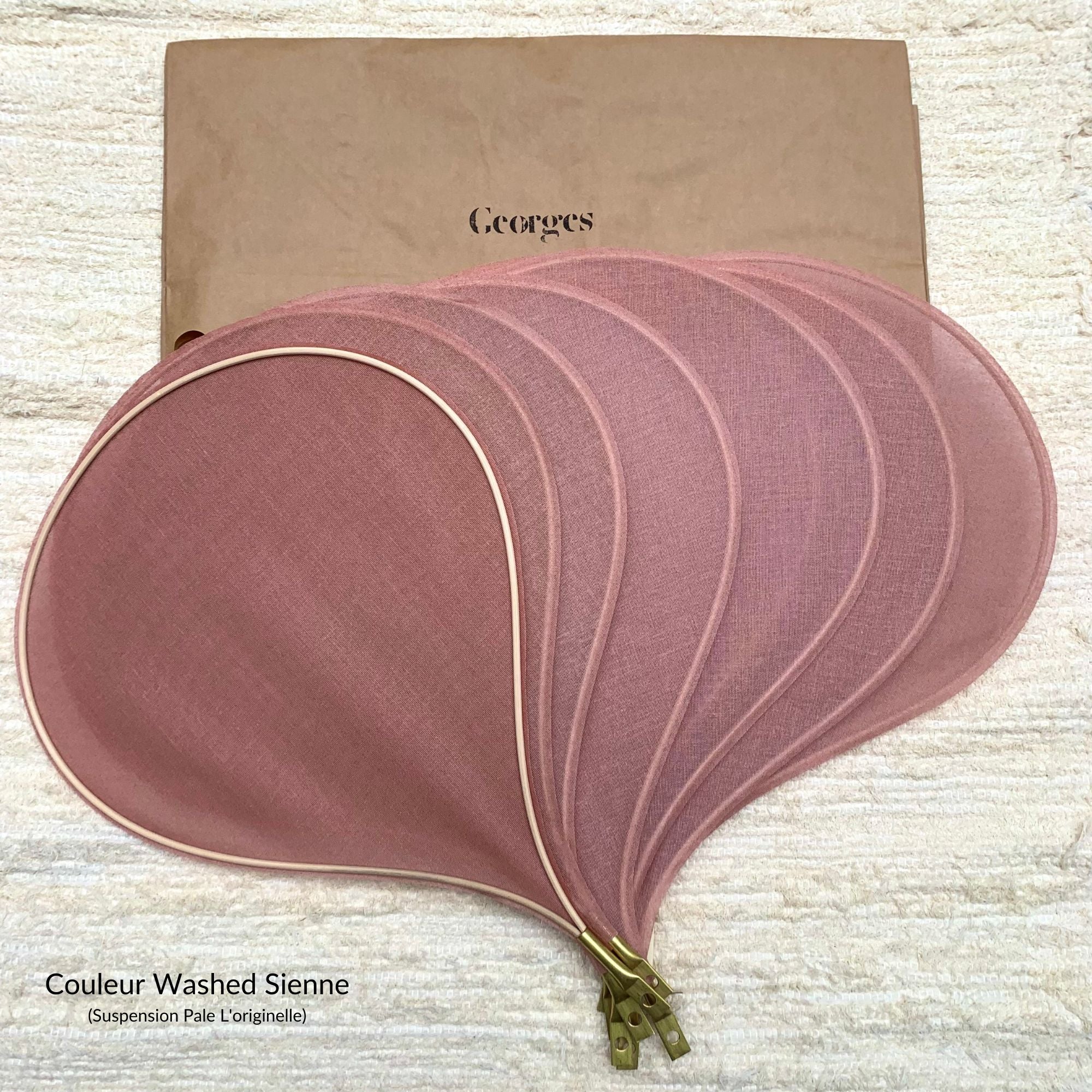 Tous les éléments de cette suspension sont fabriqués ou usinés dans l’atelier béarnais de la marque. Chaque pétale est entièrement fait main à partir d’une tige de rotin sur laquelle est tendue une toile à beurre de coton peinte avec un mélange de pigments naturels. Les pièces en laiton sont également usinées dans cet atelier.