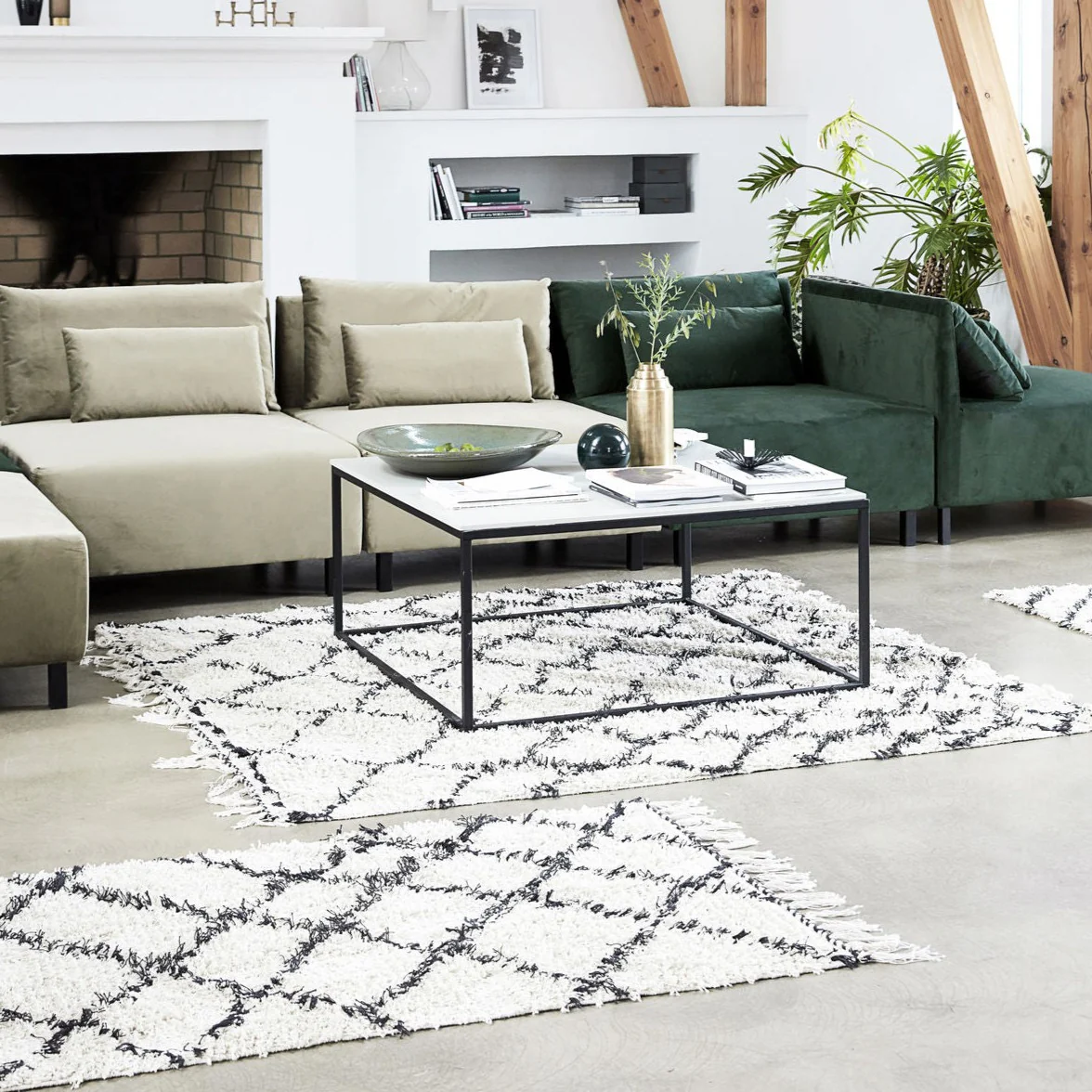 Ce tapis à poils longs appelé Kuba présente un motif de losanges noirs sur un fond blanc. La densité du velours donne au tapis en coton son côté décontracté et confère à votre salon une touche de douceur.