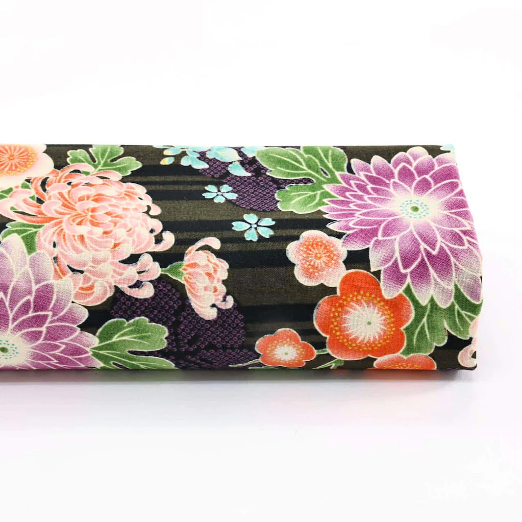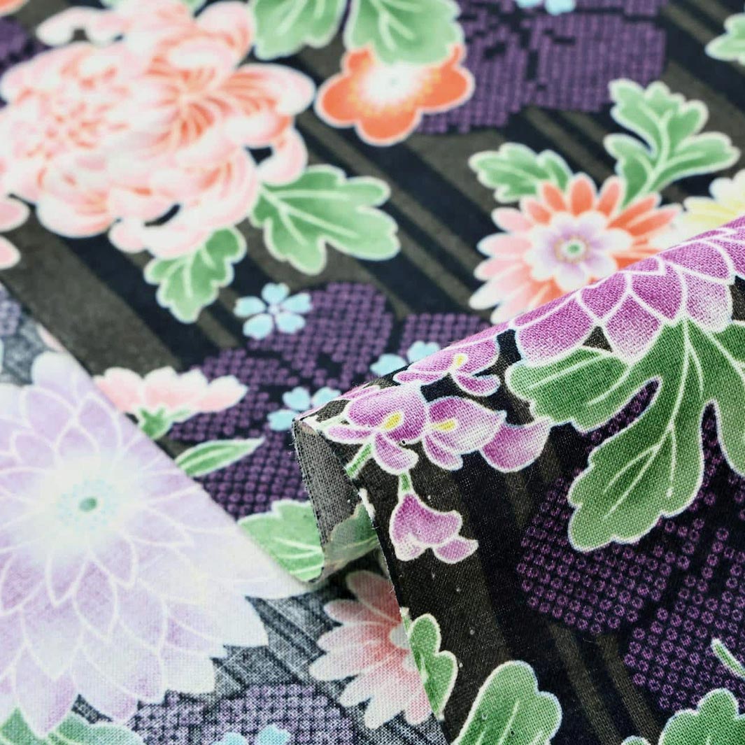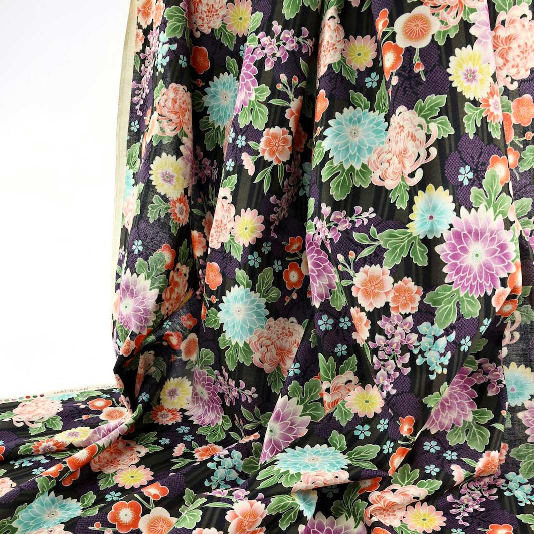 Cet élégant tissu japonais est aux motifs de chrysanthèmes, de pivoines, de fleurs de prunier et de cerisier dans les tons violets, corail, turquoise et jaunes sur fond noir.