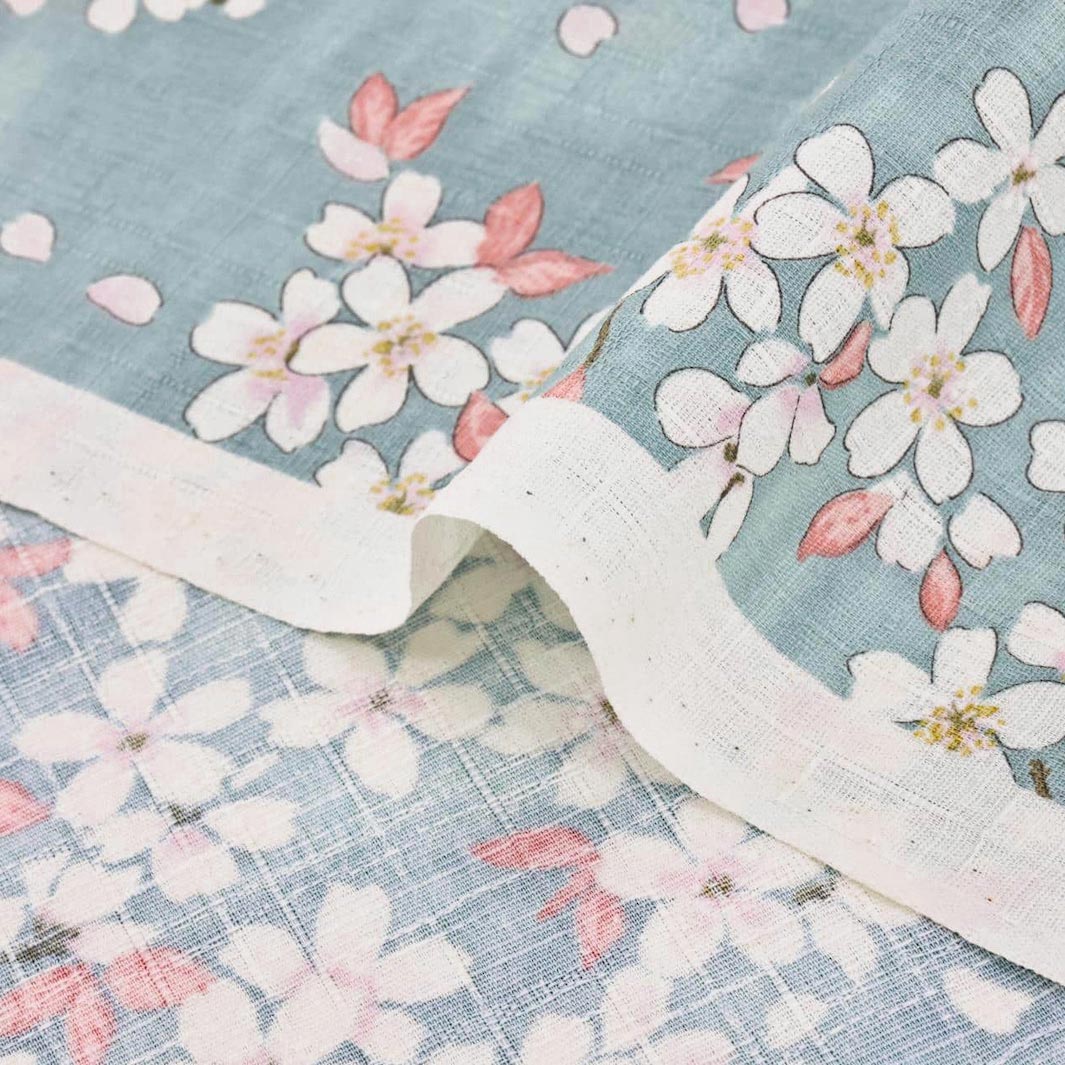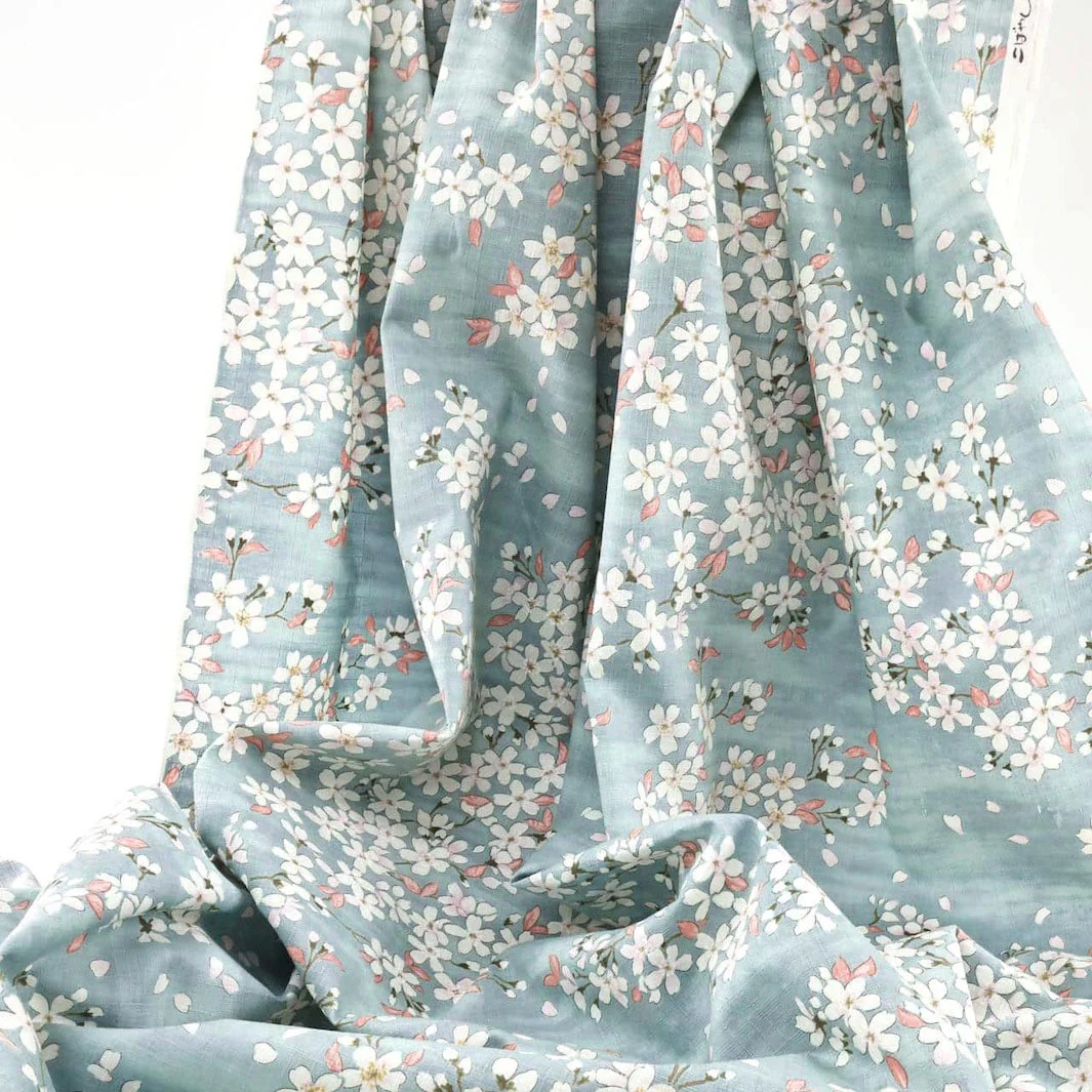 Ce joli tissu japonais est aux motifs fleurs de cerisier blanches aux détails rose clair, rose corail et jaunes sur fond bleu ciel gris.