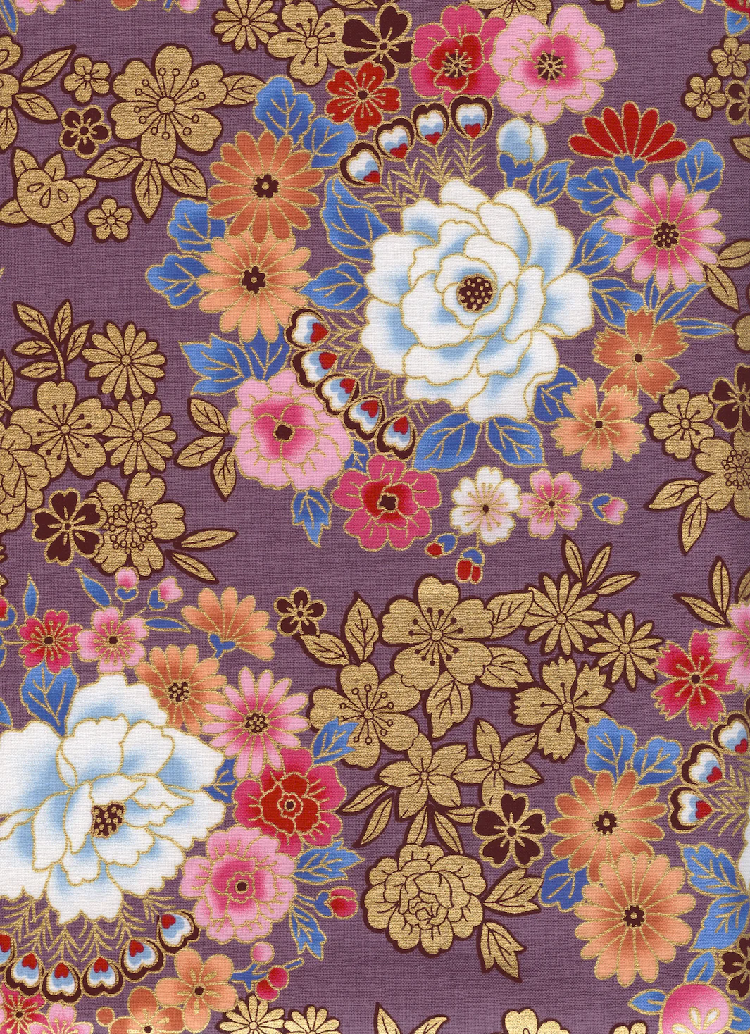 Ce joli tissu japonais est aux motifs variés de fleurs (pivoines, chrysanthèmes et fleurs de cerisier) dorées, orange, roses, bleues et beiges sur fond mauve.