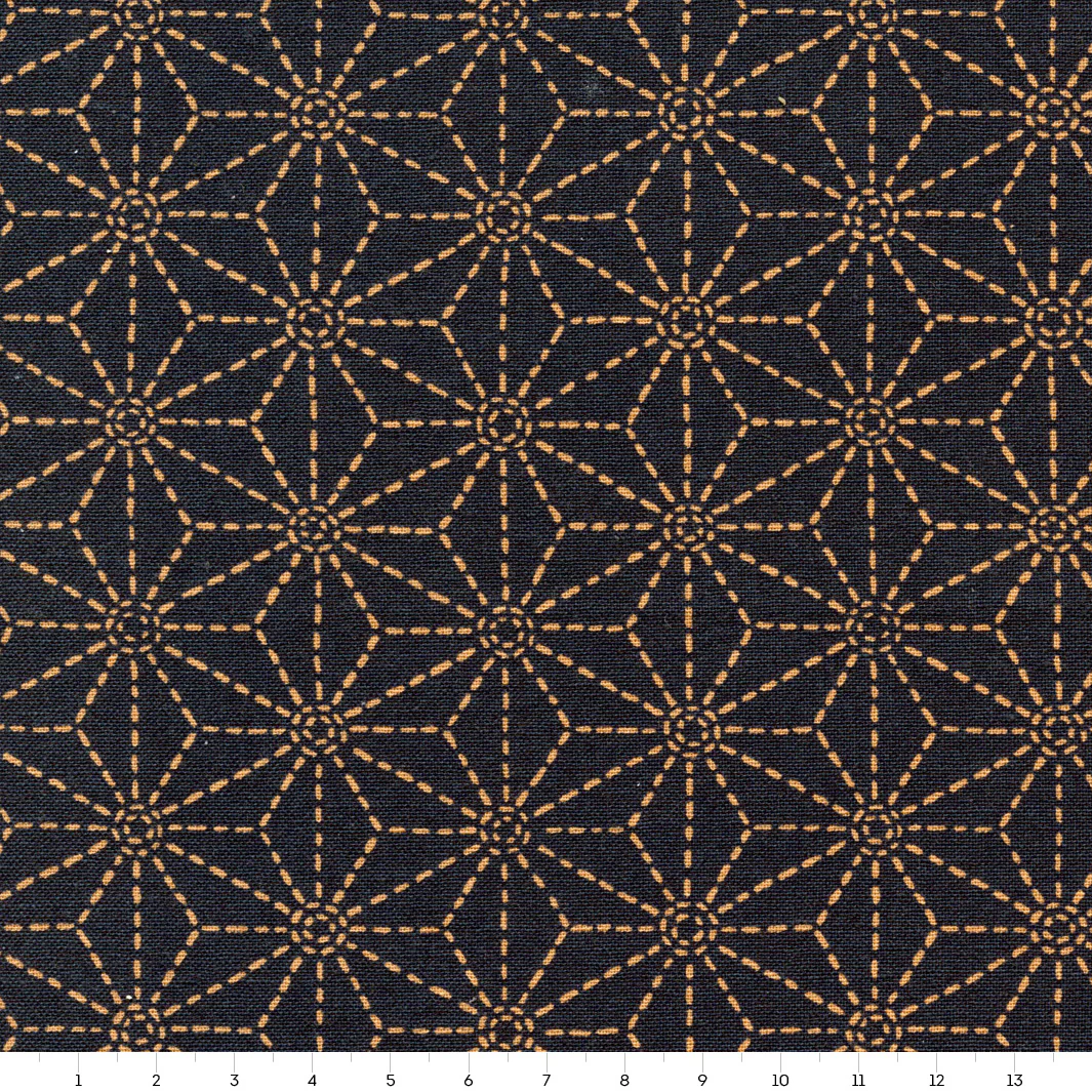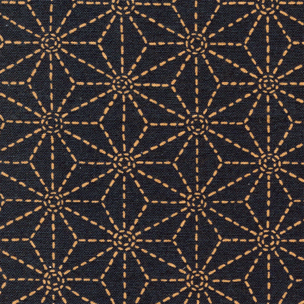 Ce joli tissu japonais est aux motifs de fleurs et de fruits variés beige chiné sur fond bleu pétrole.