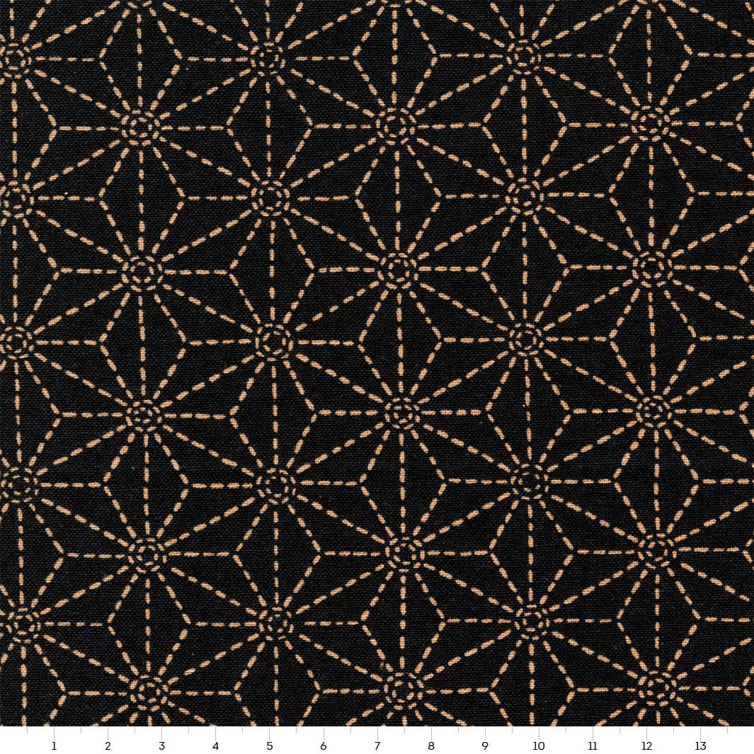 Élégant tissu japonais aux motifs de grandes étoiles graphiques beiges (qui représentent en réalité des feuilles de chanvre, ou asanoha) sur fond noir – à l’esprit sashiko (broderie japonaise).