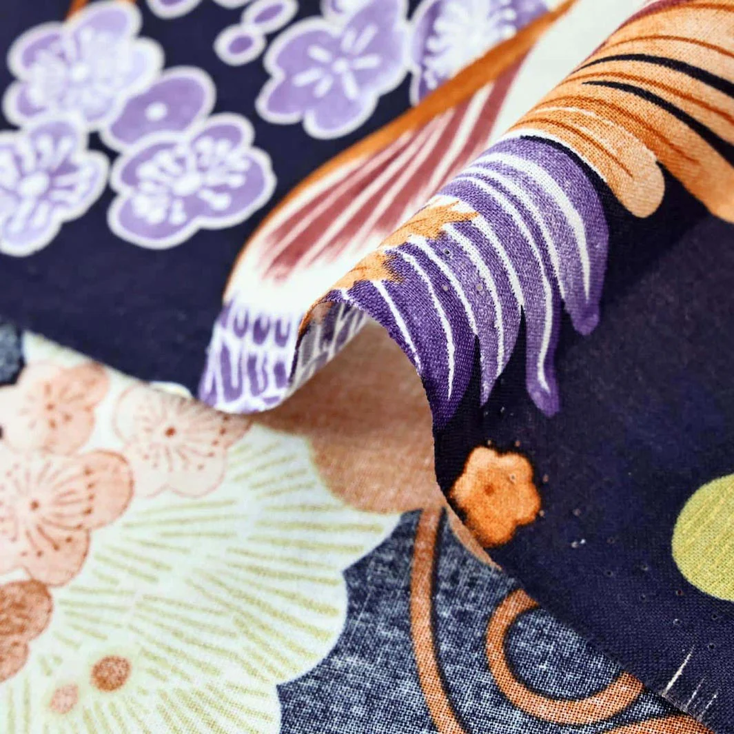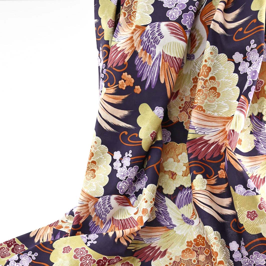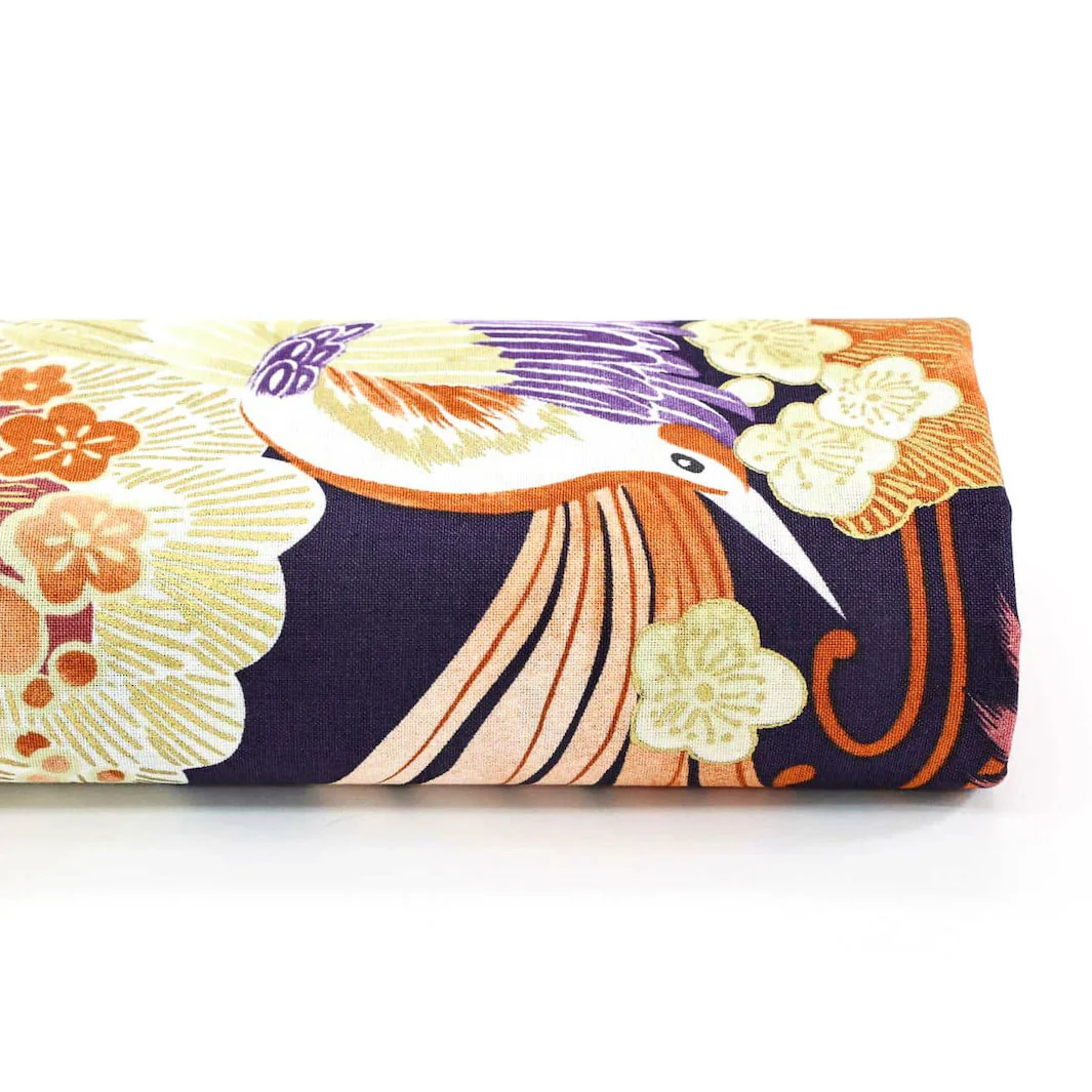 Cet élégant tissu japonais est aux motifs d’oiseaux, de fleurs de prunier et de pins dans les tons blancs, jaune vert, orange foncé, prune et violet sur fond violet foncé.