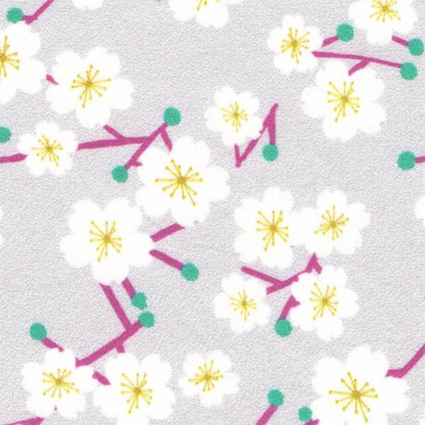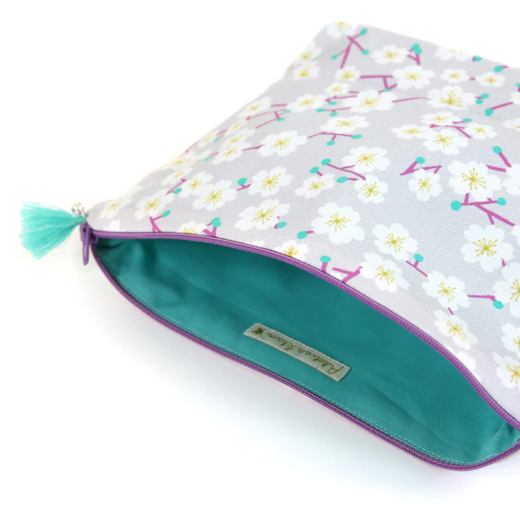 Jolie trousse avec fond plat en tissus japonais dans les tons mauves pâles, violets, verts menthe, jaunes moutarde et blanc aux motifs de branche de fleurs de cerisier (sakura), fermeture éclair violette et petit pompon vert d’eau.