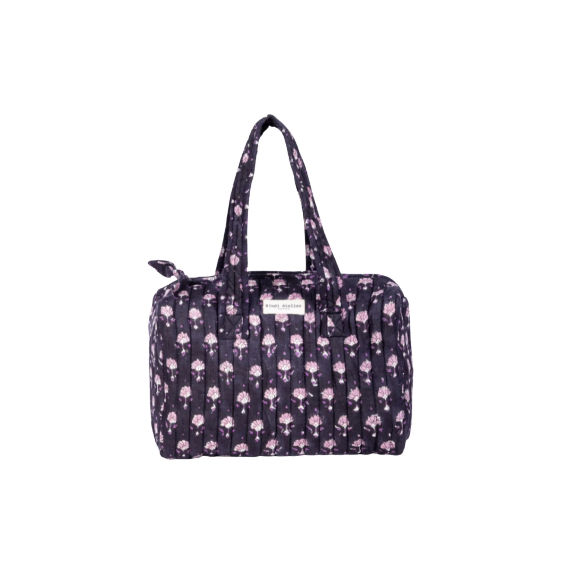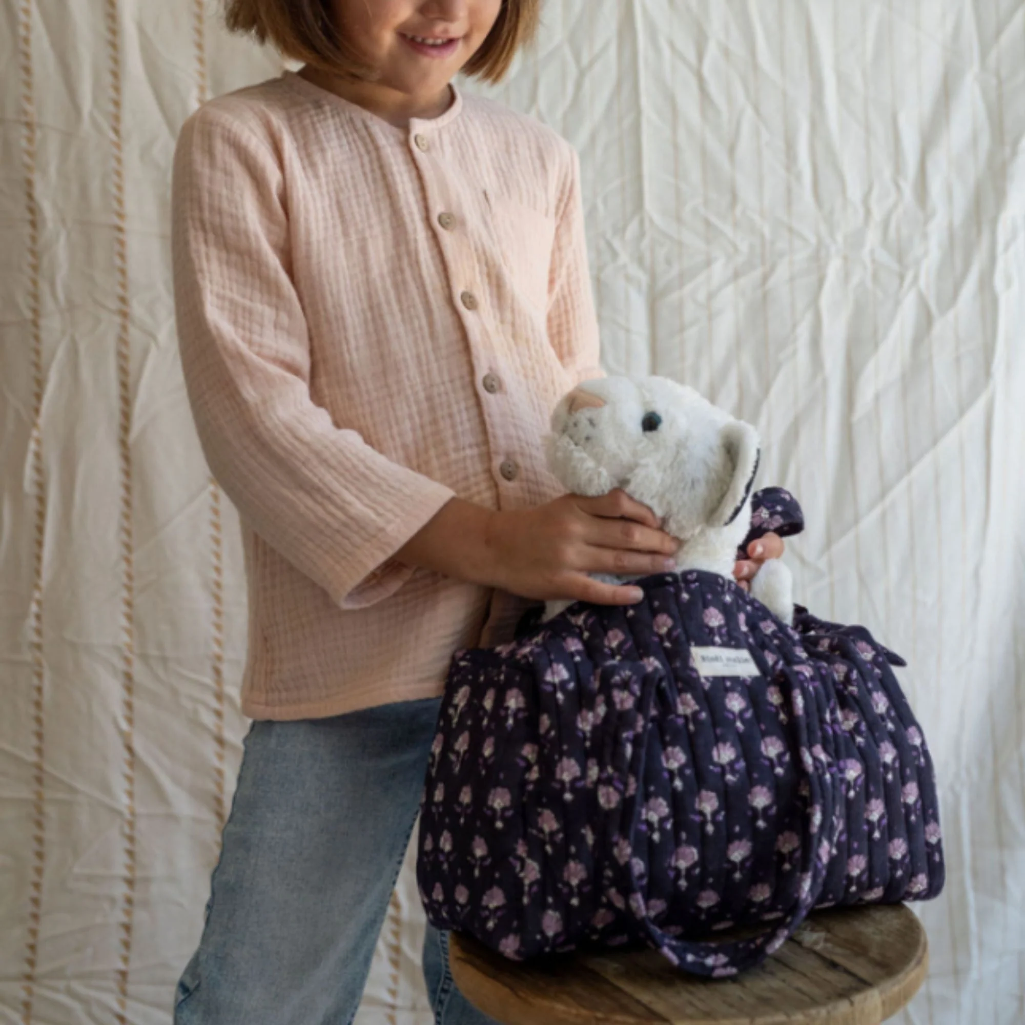 Son tissu est imprimé artisanalement en Inde selon la technique traditionnelle du block print, pour une touche authentique et unique.